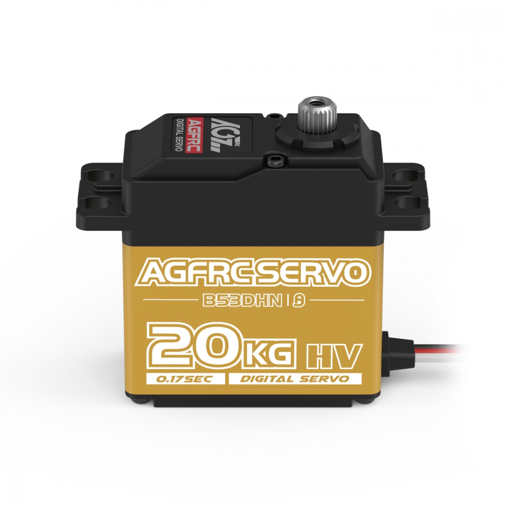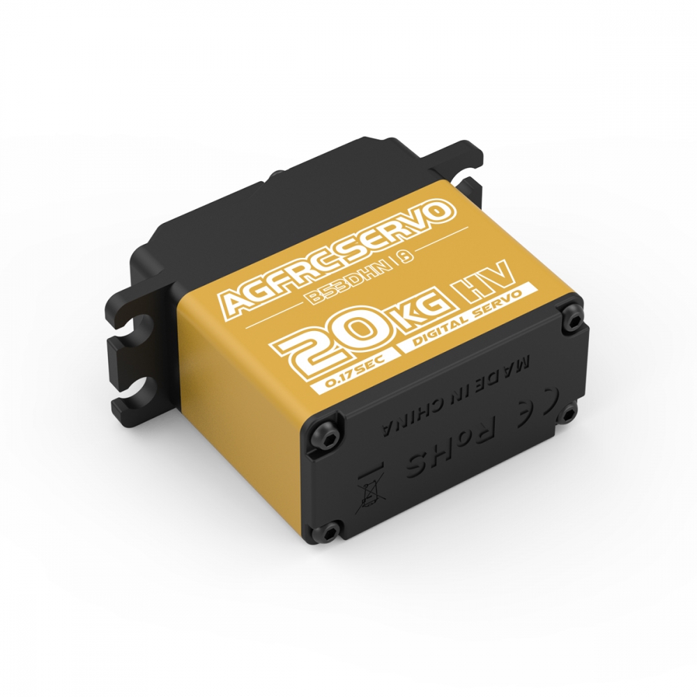The AGF-RC B53DHN is a 20mm standard servo with a partially aluminum housing. The servo is HV capable and can be operated directly on a 2s LiPo (4.8 – 8.4V).