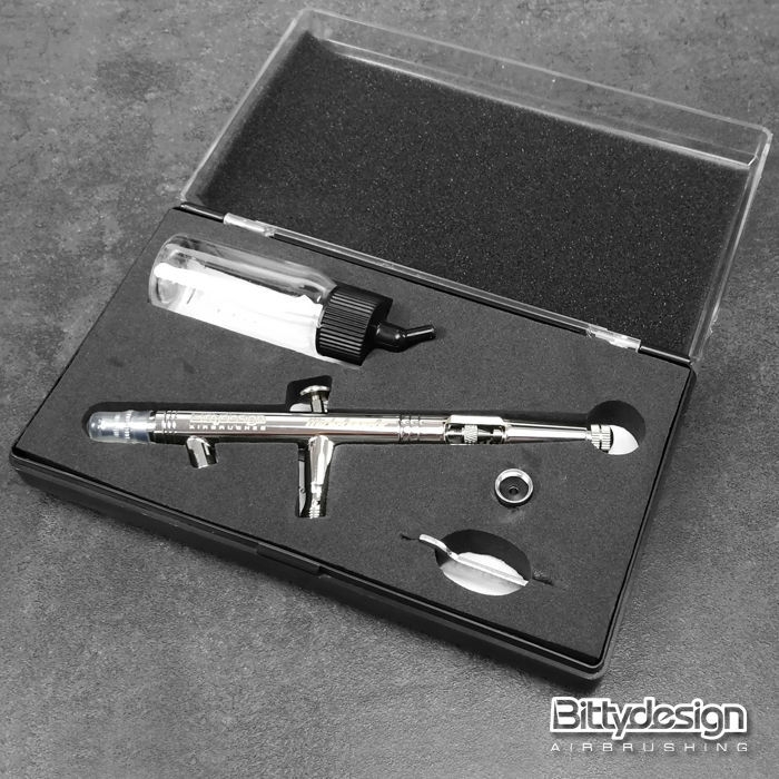 Our airbrush branded Bittydesign® Airbrushes comes with a 0.4 mm threadless nozzle designed for easy removal and maintenance and is equipped with a suction system for the color and a “dual action” lever with which you can separately control the air and color flow, pressing it adjusts the air supply while pulling it back controls the amount of color. Tested for a long time in our laboratories with intense daily use, the ‘Michelangelo’ airbrush is constantly used for our productions because it is very reliable and thanks to the quick coupling of the color bottle a lot of time is saved in changing between one color and another without any waste of paint.