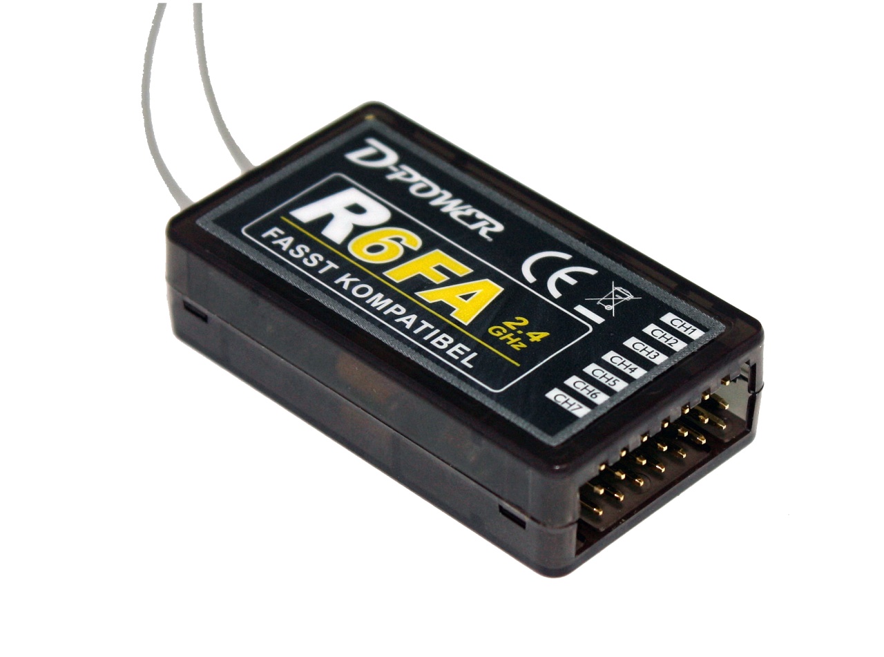 The new receivers in the D-Power series are fully compatible with Futaba Advanced SpreadSpectrum Technology. They are available in four versions with 4 to 14 channels. Manufactured to the latest standards, the R6FA features a failsafe function. The guaranteed range is between 1,800 and 2,000 meters. These specifications have been confirmed by measurements taken by a renowned engineer in Germany.