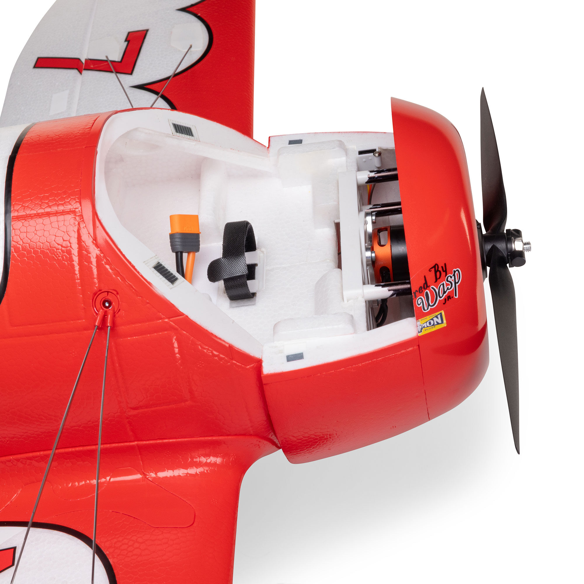 The factory-installed Spektrum brushless outrunner motor is 4S compatible, delivering excellent performance worthy of the original racer, including top speeds upwards of 100 MPH in a dive. The convenient top-mounted and magnetically secured hatch makes it easy to install and remove popular 3200–5000mAh batteries.