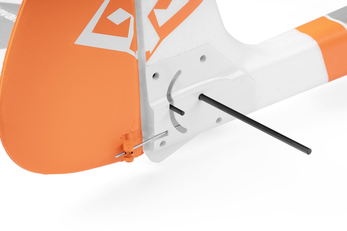 The carbon-reinforced EPO all-moving horizontal tailplane is detachable; secured with two bolts to the carbon tube joiner. You will find triangular marks on the fuselage making the correct alignment of the neutral position of the tailplane leading edge really easy.