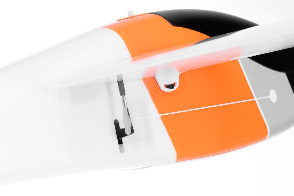 The two-piece EPO wing is reinforced by carbon spars. The wing halves are mounted on a carbon tube joiner and secured by screws. The wing halves are controlled by two servos installed fuselage driven with short push rods. You will find triangular marks on the fuselage making the correct alignment of the neutral position of the wing trailing edge really easy.