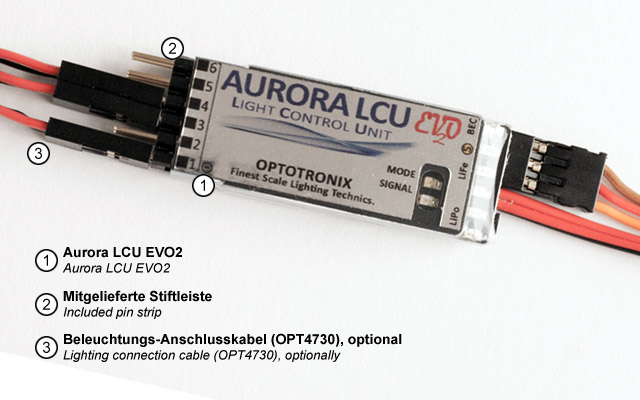 The Aurora LCU EVO2 can be operated with up to 13 volts (3S LiPo). So also connecting of LED lighting which is designed for 12 volts (LED stripes HV LEDs, etc…) is possible.