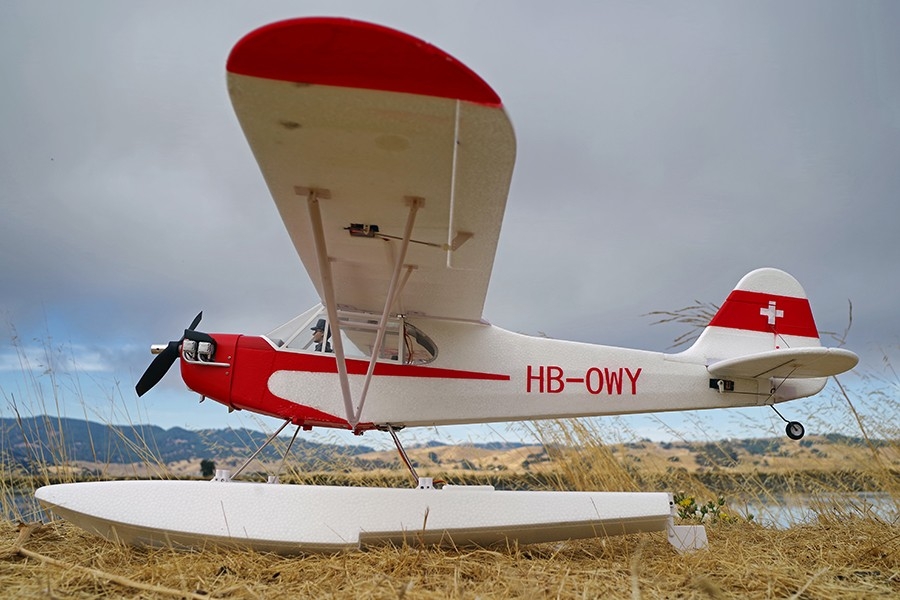 New version of ARF semi-scale model airplane Piper J-3 Cub, made of highly durable EPO, with 1400mm wingspan, brushless motor C3536-850, 40A ESC, 5 servos and amphibious undercarriage (wheels/floats). RC controlled ailerons, rudder, elevator and also water-rudder when flown with floats.